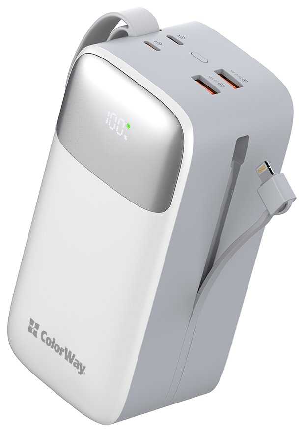 Powerbanka ColorWay CW-PB500LPA4WT-PDD představuje ideální řešení pro napájení mobilní elektroniky na cestách. Vyznačuje se obří kapacitou 50 000 mAh, díky čemuž je vhodná i pro opakované nabíjení zařízení, jako jsou smartphony, tablety, sluchátka, chytré hodinky apod. Podporuje širokou škálu protokolů rychlého napájení – jako například Power Delivery 3.0, Quick Charge, Apple Fast Charge a další. LED displej vám umožní sledovat míru nabití baterie.