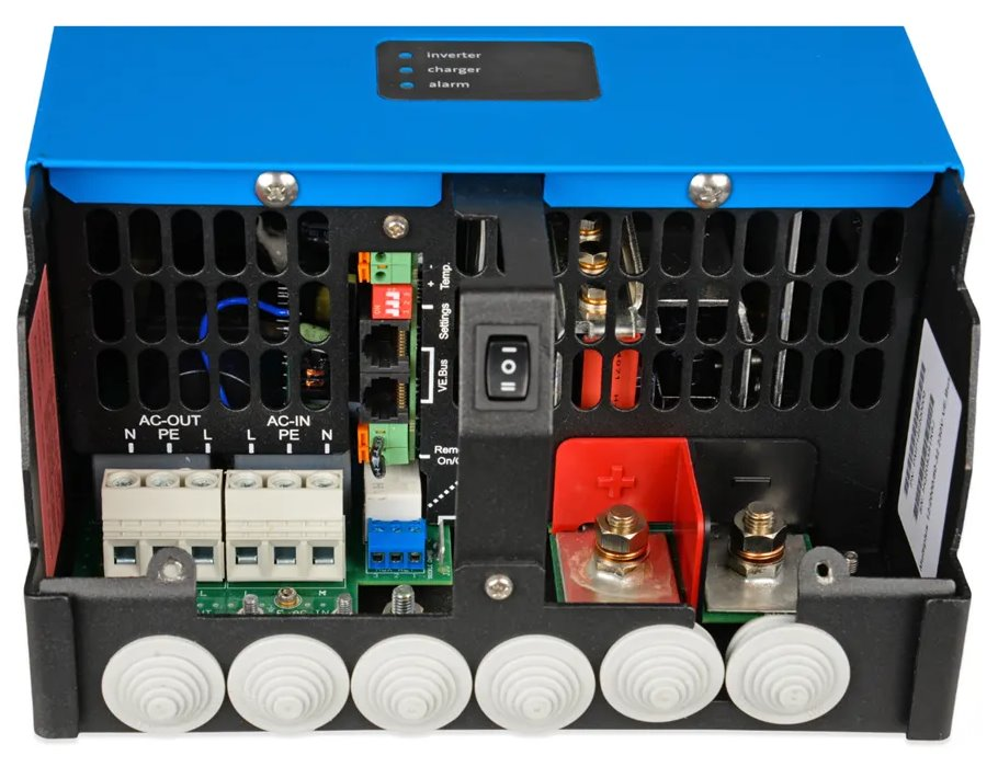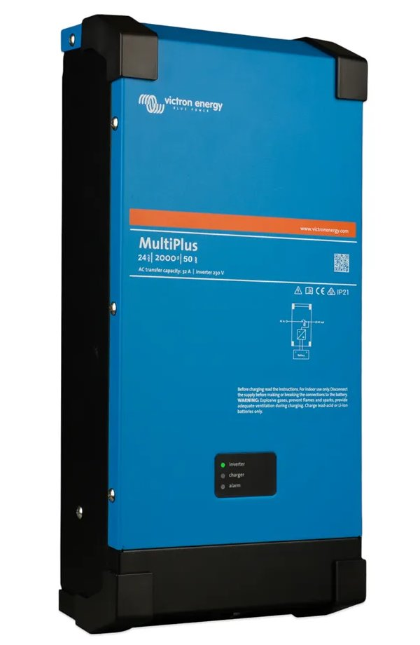 Multiplus je výkonný DC-AC hybridní měnič/nabíječ s čistě sinusovým výstupem, s integrovanou adaptivní nabíječkou baterií a ultra rychlým transferovým přepínačem zdroje napájení (baterie - externí AC zdroj). Střídač je umístěn v plastovém kompaktním krytu v atraktivním designu.