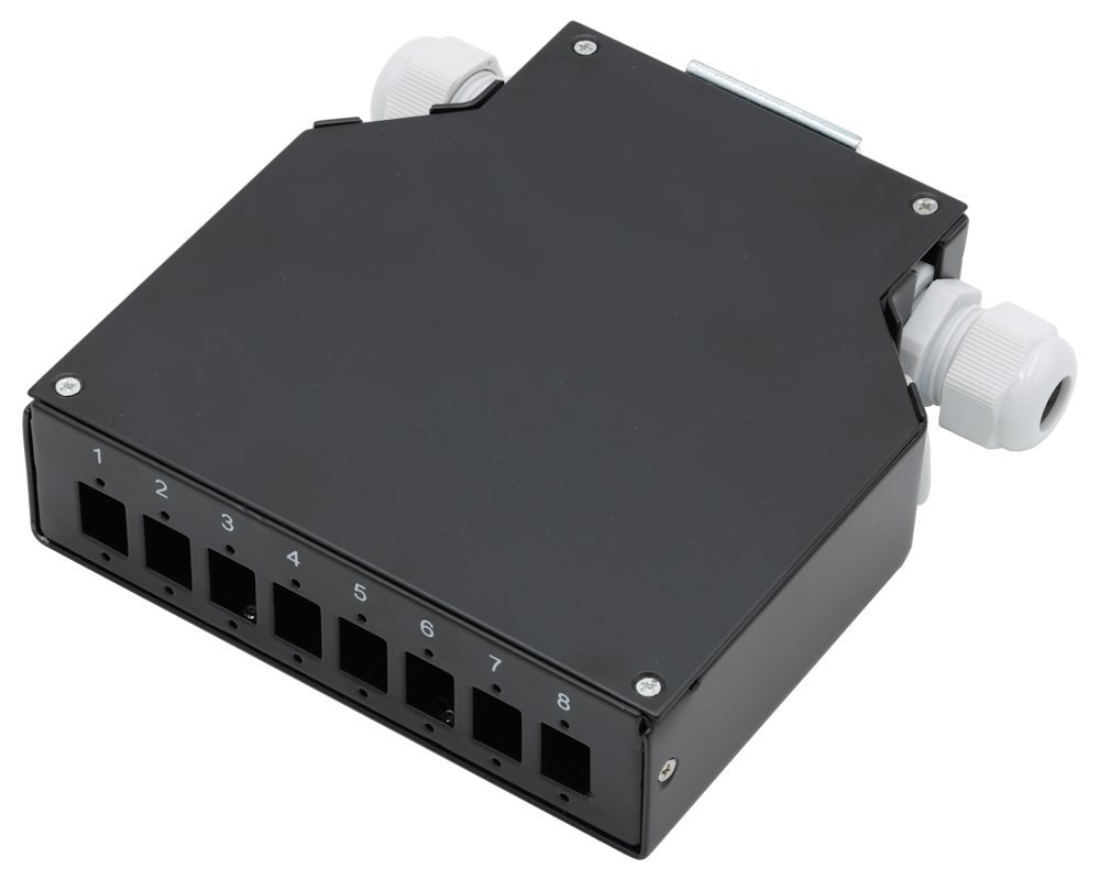 Malý kovový rozvaděč pro upevnění na DIN lištu. Dovoluje instalovat 8× SC simplex adaptér. Robustní kovové provedení, 4× vstup (2× zaslepený + 2× PG11). Kabel není nutno provlékat, lze i jen založit.