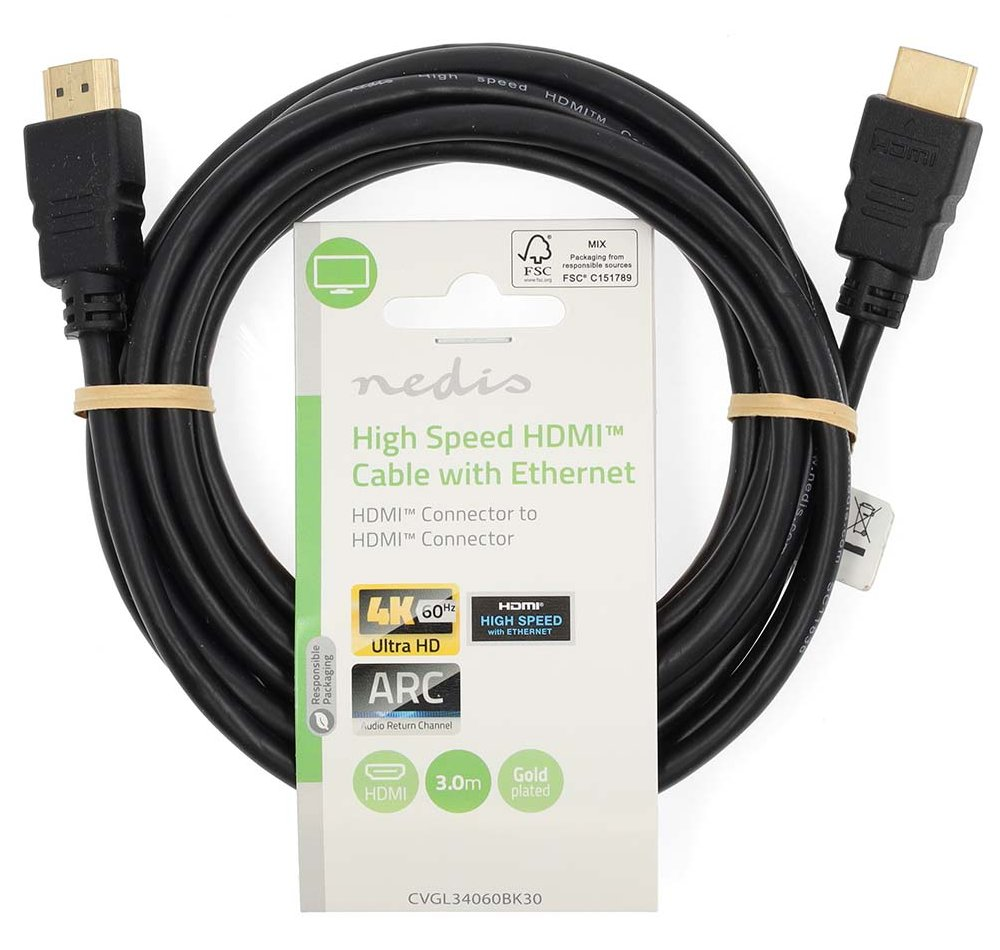 High Speed HDMI 2.0 kabel s Ethernetem a zlacenými konektory je vhodný k propojení jednotlivých zařízení. Podporuje přenos videa v rozlišení 4K při 60 Hz a funkce jako je ARC (Audio Return Channel), HDCP nebo 3D obsah ve Full HD.