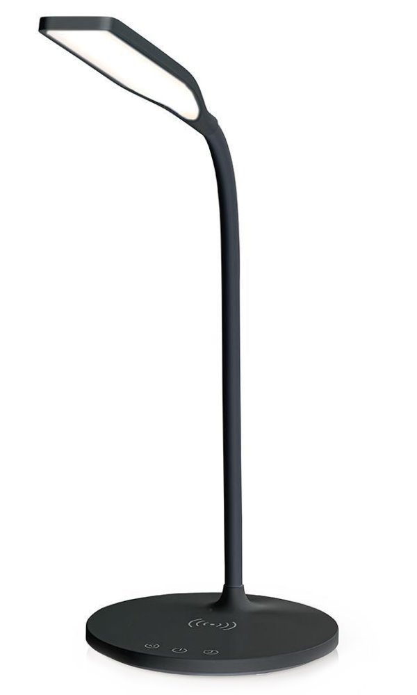 LED stolní lampička s naklápěcí konstrukcí umožňuje nasměrovat světlo přesně tam, kam potřebujete. Pouhým stisknutím tlačítka si můžete zvolit barevnou teplotu od teplé bílé až po studenou. Protiskluzové podložky zajišťují stabilní umístění na stole. Lampička je navíc vybavena bezdrátovou nabíječkou standardu Qi s výkonem 15 W.