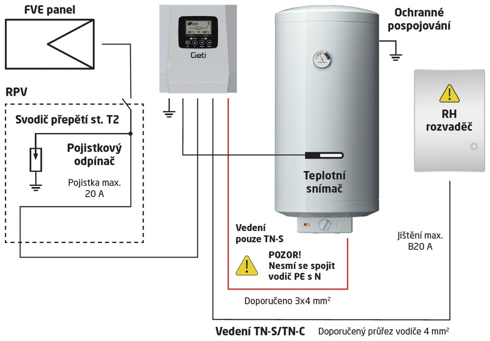 Upozornění: Invertor GETI GWH je vhodný pouze pro odporové zátěže s bimetalovým termostatem. Není vhodný pro elektronikou řízené termostaty! Výstup invertoru (L, N) nesmí být připojen k elektrické síti nebo uzemnění! Výstup invertoru nesmí být zapojen do soustavy TN-C.