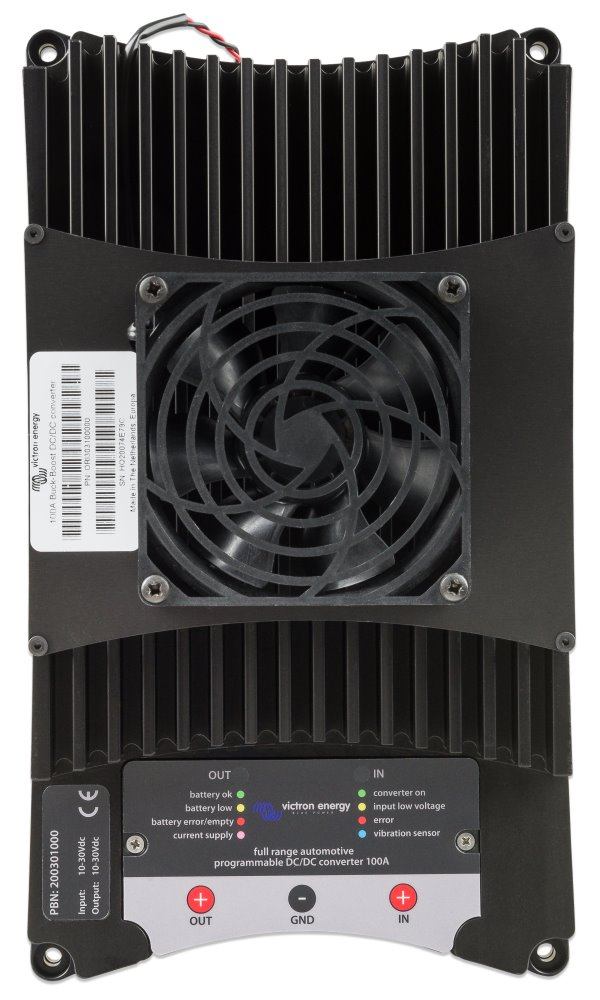 Victron Buck-Boost je DC-DC konvertor pro nabíjení 12V nebo 24V servisní baterie ve vozidlech s inteligentním alternátorem (rekuperační brzdění, motory Euro 5 a Euro 6). Konvertor nabíjí pomocnou baterii předem nastaveným nabíjecím napětím, čímž eliminuje vysoké a nízké napětí.