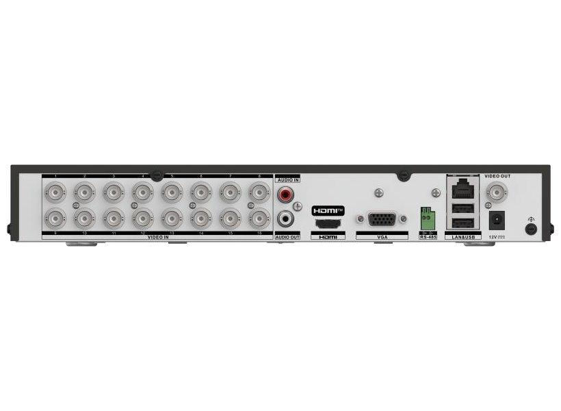 Porty: 16× BNC, 1× CVBS video výstup (BNC), 1× HDMI 4K výstup, 1× VGA výstup, 2× USB 3.0, 1× USB 2.0, 1× RJ-45, 1× RS-485, 1× audio vstup (RCA), 1× audio výstup (RCA)