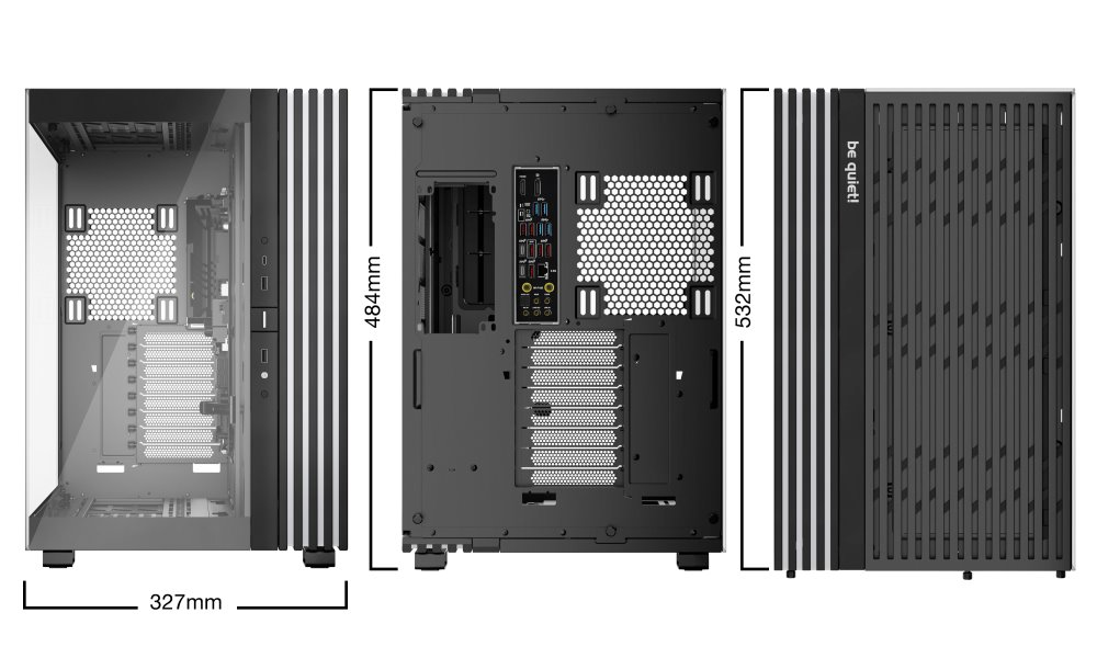 Další předností je podpora přemístitelných nožiček, díky čemuž můžete PC otočit a umístit ve svislé i vodorovné poloze. PC skříň Be quiet! LIGHT BASE 900DX nabízí až 10 pozic pro ventilátory a 2 integrované rozbočovače ventilátorů. Po této stránce je skříň mimořádně univerzální a ve spojení s prostorem uvnitř vám umožní vytvořit rozmanité konfigurace s extrémně výkonnými grafickými kartami, radiátory nebo základními deskami ve formátu E-ATX, XL-ATX, ATX, Micro ATX, Mini-ITX.