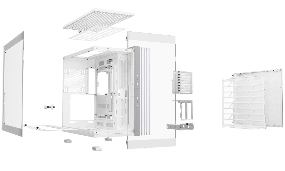 Unikátní počítačová skříň s průhlednou bočnicí i předním panelem formátu Middle Tower nabízí dostatek prostoru pro montáž většiny dostupných komponent. Hlavní předností této skříně je možnost rychlé změny její orientace díky systému odnímatelných a přemístitelných nožiček. Skříň je dodávána bez předinstalovaných ventilátorů, nabízí ale až 10 pozic pro ventilátory a dva integrované rozbočovače ventilátorů a ARGB. Na předním panelu se nachází dva porty USB 3.0, jeden port USB-C, sluchátkový výstup a audio vstup pro mikrofon. Herní design ještě doplňuje elegantní ARGB osvětlení lemující strany skříně, díky čemuž je viditelné bez ohledu na to, v jaké orientaci skříň používáte. Ve skříni je dostatek prostoru pro chladič CPU do výšky až 190 mm a grafickou kartu o délce až 495 mm. Důmyslné řešení umožňuje pohodlné umístění až 420 mm dlouhého výměníku vodního chlazení na horní nebo spodní straně. Potěší také přítomnost prachových filtrů či integrovaná podpěra grafické karty. Skříň je dodávána bez zdroje.