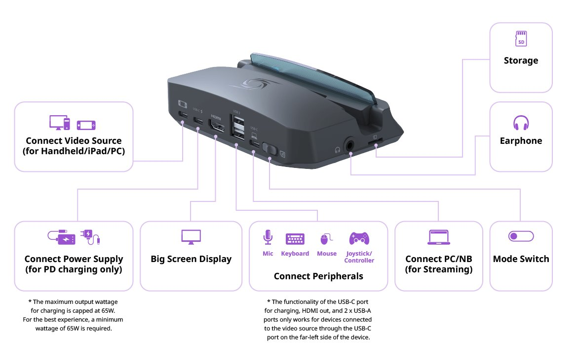 Rozhraní: 1× HDMI (výstup), 1× USB-C (video vstup; DP Alt Mode), 1× USB-C (vstup PD napájení; až 65 W), 1× USB-C (pro připojení k PC), 2× USB 3.0, 1× sluchátkový výstup, 1× microSD slot
