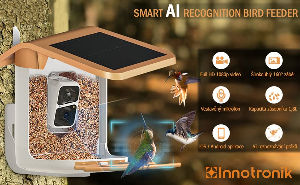 Chytré krmítko je ideálním řešením pro sledování ptačího života z pohodlí vašeho domova. Kamera s rozlišením Full HD a širokým úhlem záběru 160° diagonálně poskytuje ostrý a detailní obraz, a to i v noci díky IR přísvitu s dosahem až 7 metrů. PIR senzor okamžitě zaznamená pohyb u krmítka a zašle vám notifikaci, abyste nezmeškali žádný vzácný okamžik. Záznamy se ukládají přímo do vašeho mobilního zařízení, na micro SD kartu (až 128 GB) nebo do cloudového úložiště. Ty nejlepší momenty si můžete užít také v reálném čase přímo na vašem mobilním zařízení díky aplikaci VicoHome, která je kompatibilní s Android a iOS a je k dispozici také v češtině. Kamera navíc nabízí možnost aktivace pokročilé funkce Al Bird Recognition, která dokáže rozpoznat více než 1000 druhů ptáků, což vám umožní stát se skutečným expertem na ptačí faunu. Součástí krmítka je integrovaný reproduktor a mikrofon, který umožní kvalitní oboustrannou komunikaci. Krmítko je napájeno solárním panelem a baterií s kapacitou 5200 mAh, která zajišťuje provoz až 12 měsíců v režimu Standby. Zařízení je odolné vůči vodě a prachu s krytím IP65, což zajišťuje dlouhodobou výdrž i v náročných venkovních podmínkách.