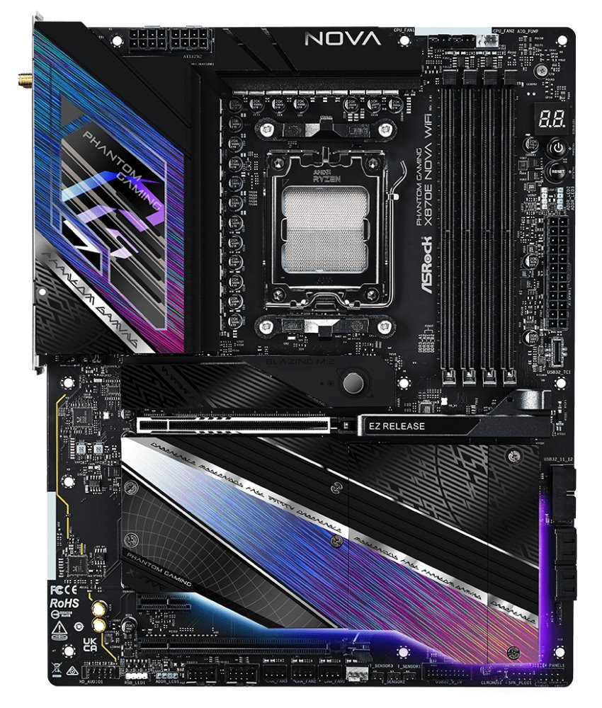 Díky tomu je základní deska ASRock X870E Nova WiFi ideální pro extrémní multitasking a nekompromisní výpočetní výkon. Rozhraní PCIe Gen5 Blazing M.2 představuje řešení pro vysokorychlostní SSD jednotky. Díky násobně vyšší šířce pásma můžete ultrarychlá úložiště využít naplno. Extra velký chladič M.2 z hliníkové slitiny zajistí efektivní chlazení disku M.2 SSD. Na své si přijdou také kutilové, kterým provedení desky poskytuje dostatek možností pro jejich stavební záměry. Základní deska ASRock X870E Nova WiFi dbá také na řádnou konektivitu.