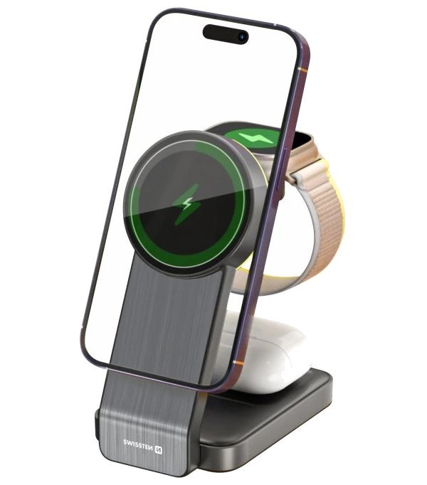 Praktická bezdrátová nabíječka nabízí tři nabíjecí plochy, díky čemu umožňuje nabíjet současně telefon, hodinky i sluchátka. Disponuje rychlým nabíjením o výkonu až 15 W pro chytrý telefon, 5 W pro sluchátka a 5 W pro chytré hodinky. Výhoda stojánku je osvětlení magnetického rámečku u nabíjení telefonu. Díky světlu krásně rozpoznáte, kam máte telefon umístit a díky technologii MagSafe (verze iPhonů 12 a vyšší) se telefon magneticky zarovná a začne nabíjet. Světlo se dá lehce vypnout tlačítkem umístěným u dobíjení sluchátek. K dispozici je navíc také funkce FOD, která dokáže rozpoznat cizí předmět a okamžitě upozorní uživatele na jeho odstranění blikáním ukazatele nabíjení. S bezdrátovou nabíječkou lze snadno cestovat a manipulovat, lze jednoduše složit i rozložit.