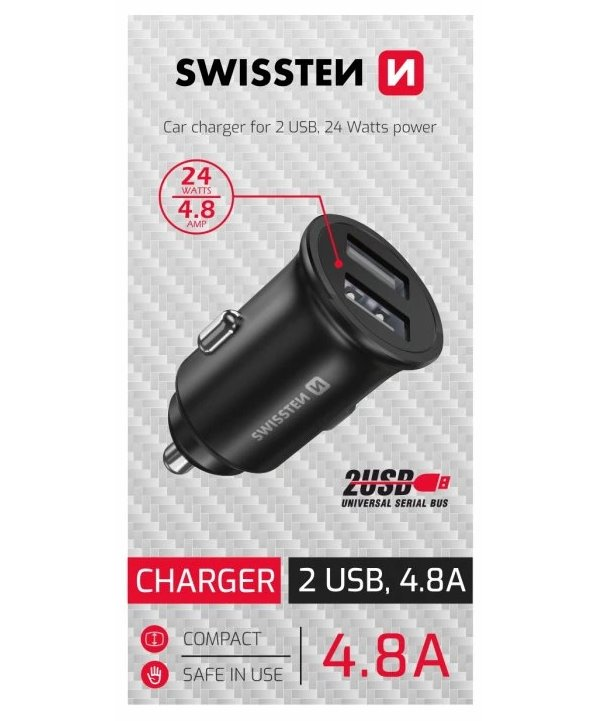 Minimalistická autonabíječka s odolným tělem z leštěného kovu, dvěma USB výstupy a celkovým výkonem až 24 W. Každý z USB portů dokáže nabíjet proudem až 2,4 A. Technologie rychlého dobíjení pro Android Fast Charge je zárukou rychlého a kvalitního dobití vašich telefonů i tabletů. Nabít s ní ale zvládnete i Apple iPhone či iPad. Toto balení je díky vhodné velikosti určeno pro doplnění samoprodavače SWISSTEN.
