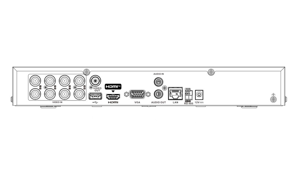 Porty: 8× BNC, 1× CVBS video výstup (BNC), 1× HDMI Full HD výstup, 1× VGA výstup, 2× USB 2.0, 1× RJ-45, 1× RS-485, 1× audio vstup (RCA), 1× audio výstup (RCA)