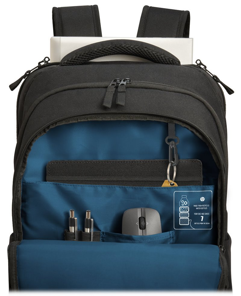 Stylový batoh HP Renew Professional 17,3" pro přenášení notebooku, který je praktický a navržen s ohledem na ekologii. Batoh je dostatečně prostorný, aby se do něj vměstnal velký notebook, příslušenství a další předměty, včetně odpolední svačiny. Vyznačuje se pevným a odolným zpracováním, díky čemuž efektivně ochrání váš notebook během přenášení. Navíc se snadno čistí, takže si uchovává svůj původní vzhled po dlouhou dobu. Hlavní část batohu HP Renew Professional byla vyrobena ze 100% recyklovaných plastů vylovených z oceánu. Další prvky jako štítky, šňůrky nebo vycpávkové hmoty jsou vyrobeny ze 100% recyklovaných a biologicky rozložitelných materiálů.