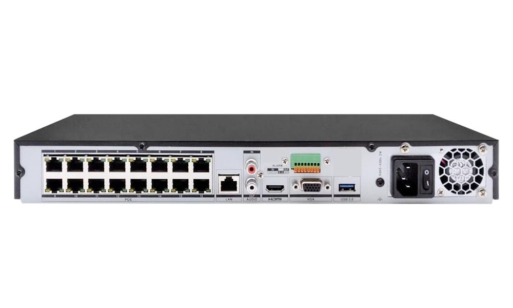 Porty: 1× HDMI 4K výstup, 1× VGA Full HD výstup, 2× USB 2.0, 1× RJ-45 (10/100/1000 Mbps), 16× RJ-45 (PoE podpora), 4× alarm vstup, 1× alarm výstup, 1× audio vstup, 1× audio výstup