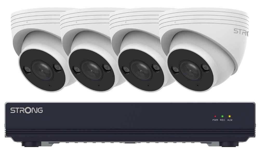 Sestava záznamového zařízení Strong NVR1120-8P a čtyř 5Mpx kamer Strong TUR05DL0-P.