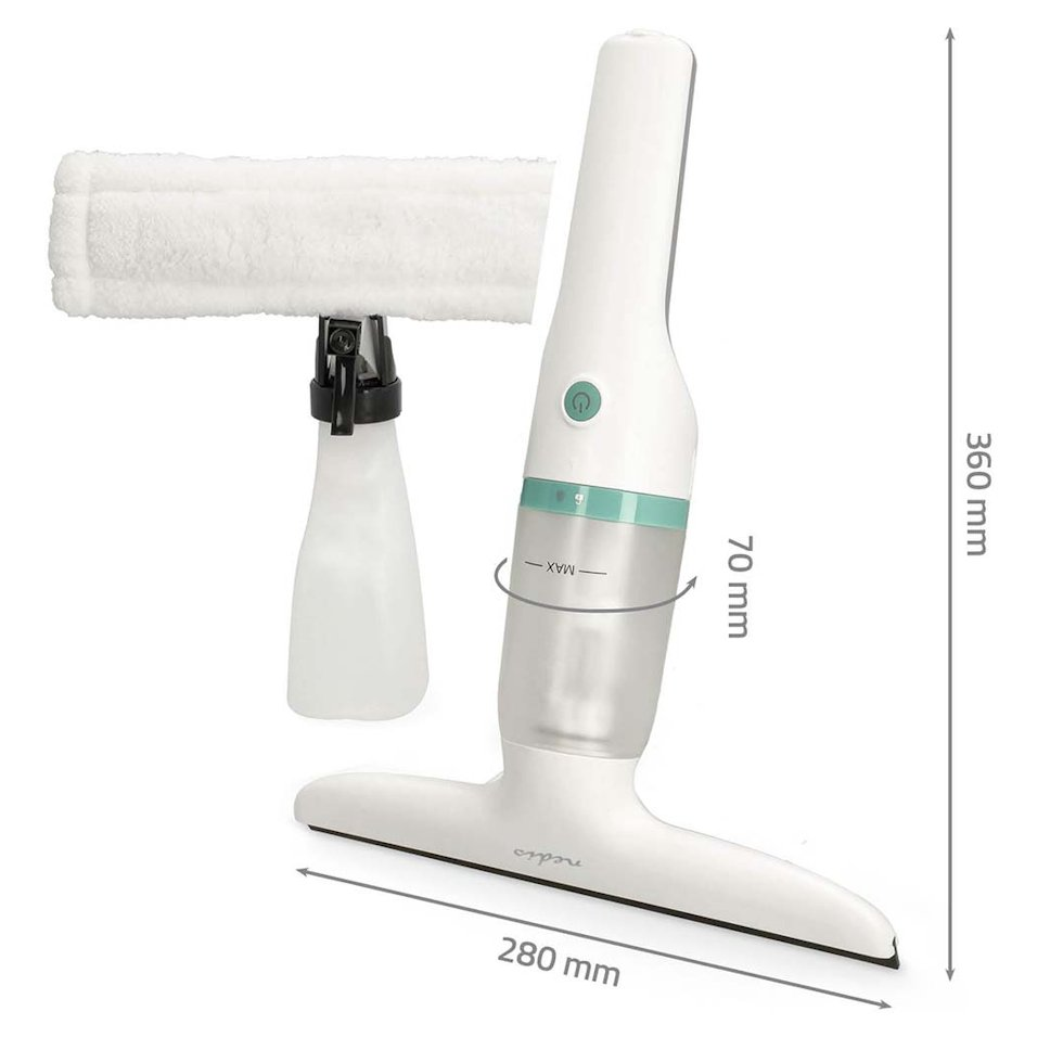Lehký okenní vysavač se stěrkou a mopem z mikrovlákna je dokonalým společníkem do domácnosti. Naplňte láhev čisticím prostředkem a nasprejujte jej přímo na okno. Pomocí mopu okna umyjete a vysavač s 28 cm širokou stěrkou se postará o to, aby zůstala bez šmouh a dokonale čistá. Špinavá voda se shromažďuje v odnímatelné nádrži na vodu o objemu 60 ml, takže se nemusíte vláčet s těžkým kbelíkem. Navíc lze používat na čištění všech hladkých povrchů, včetně zrcadel, dlaždic a sprchových koutů. Díky integrované baterii s kapacitou 2200 mAh, kterou lze nabíjet pomocí USB-C konektoru, dokáže vysávat až 45 minut.