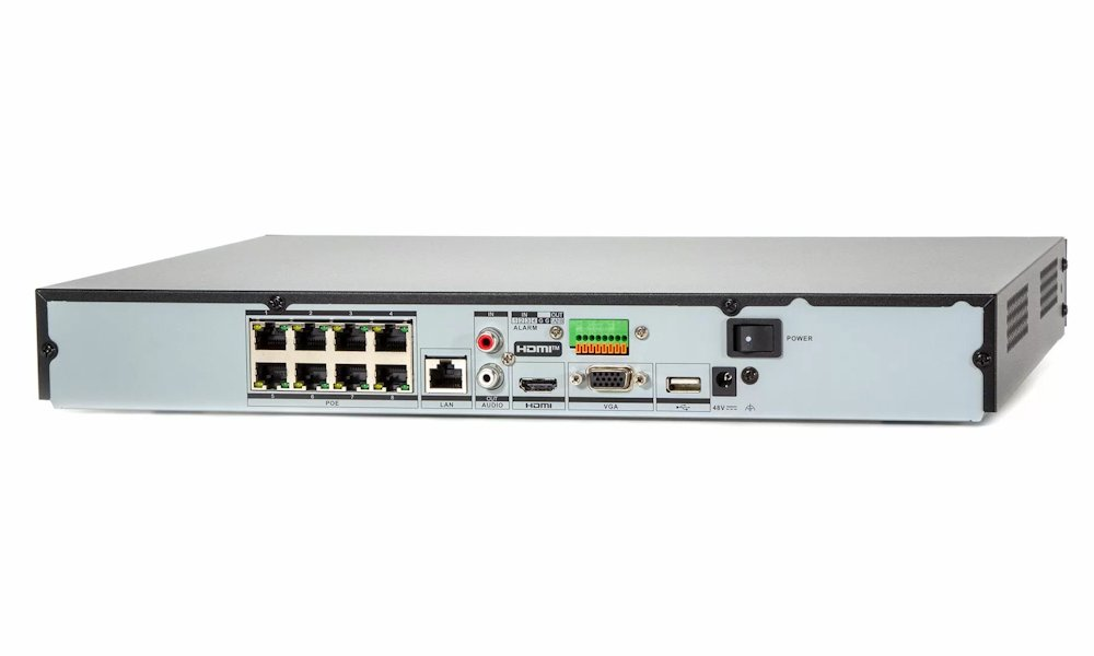 Porty: 1× HDMI 4K výstup, 1× VGA Full HD výstup, 2× USB 2.0, 1× RJ-45 (10/100/1000 Mbps), 8× RJ-45 (PoE), 4× alarm vstup, 1× alarm výstup, 1× audio vstup (RCA), 1× audio výstup (RCA)
