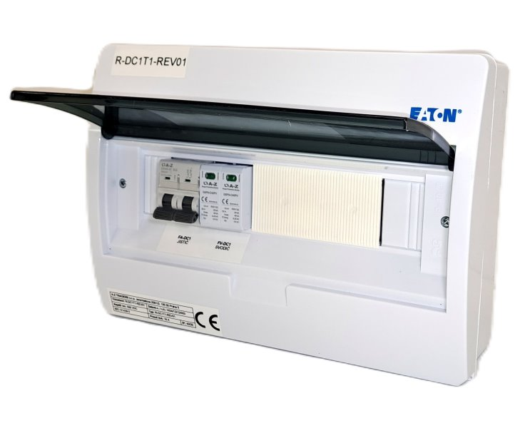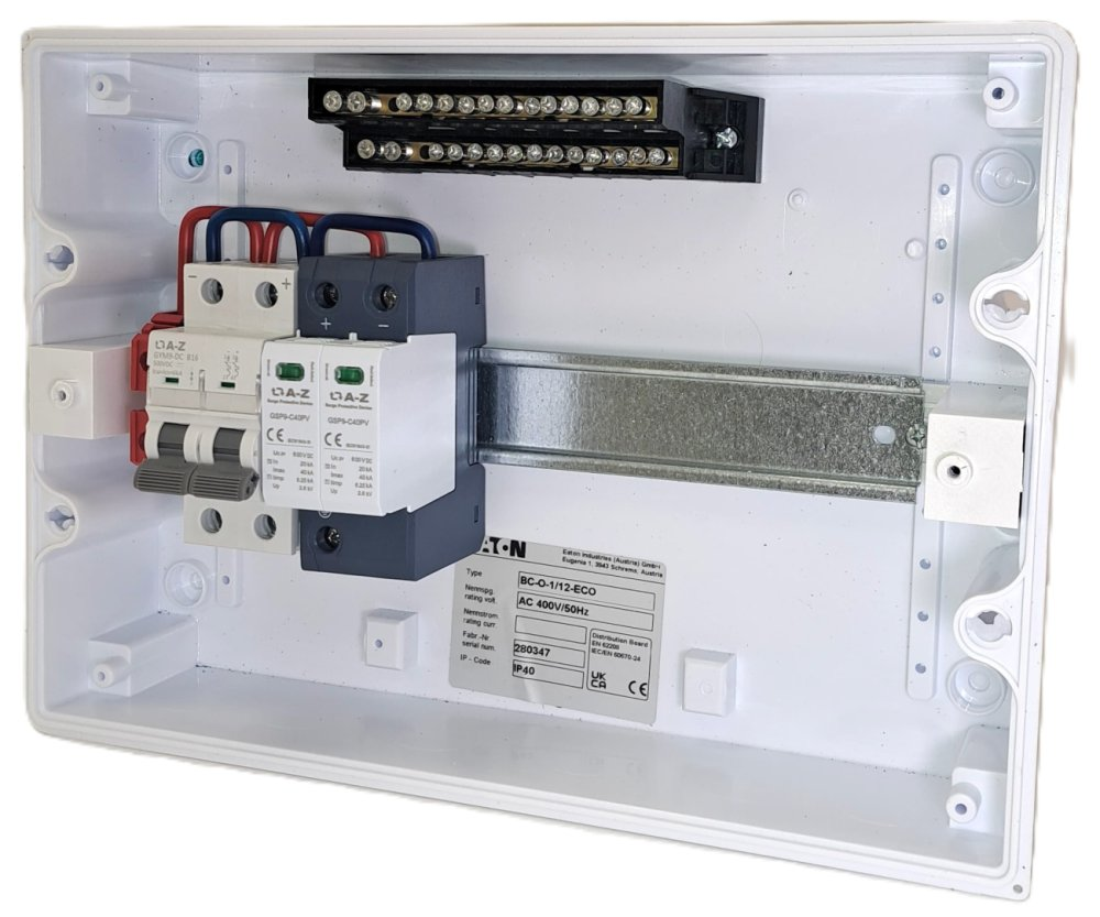 V rozváděči je osazen svodič přepětí DC třídy T1+T2 a dvoupólový DC jistič pro jištění DC vstupu střídače.