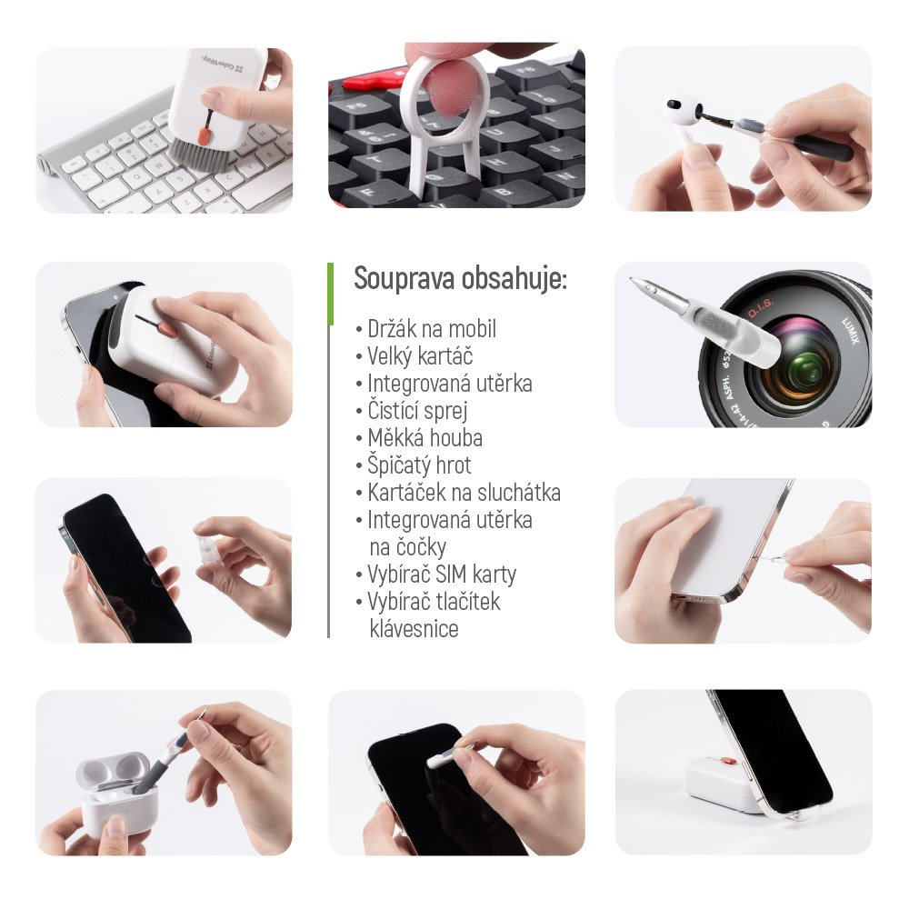 Čisticí sada navržená pro bezpečné a důkladné čištění elektronických zařízení bez rizika poškození povrchů. Obsahuje specializované nástroje, které umožňují efektivně odstranit prach, nečistoty, otisky prstů a další usazeniny z klávesnic, sluchátek, displejů a dalších citlivých částí elektroniky. Díky široké škále nástrojů lze dosáhnout i do těžko přístupných míst, jako jsou mezery mezi klávesami, mřížky reproduktorů nebo vnitřní části sluchátek. Mikrovláknová utěrka a měkký kartáček zajišťují šetrné čištění bez škrábanců či jiného poškození. Kompaktní design s integrovaným držákem na telefon činí tuto sadu ideálním společníkem pro domácí i cestovní použití.