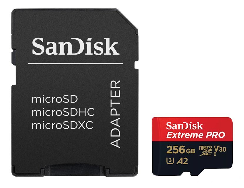 Paměťová karta formátu micro SDXC nabízí kapacitu 256 GB. Rychlost čtení je až 200 MB/s a rychlost zápisu až 140 MB/s. Součástí balení je SD adaptér a software pro obnovu dat RescuePRO s licencí na 2 roky, který umožňuje obnovit omylem smazané obrázky.