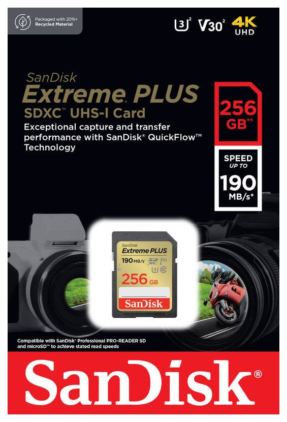 Paměťová karta formátu SDXC nabízí kapacitu 256 GB. Rychlost čtení je až 190 MB/s a rychlost zápisu až 130 MB/s. Součástí je software pro obnovu dat RescuePRO s licencí na 2 roky, který umožňuje obnovit omylem smazané obrázky.