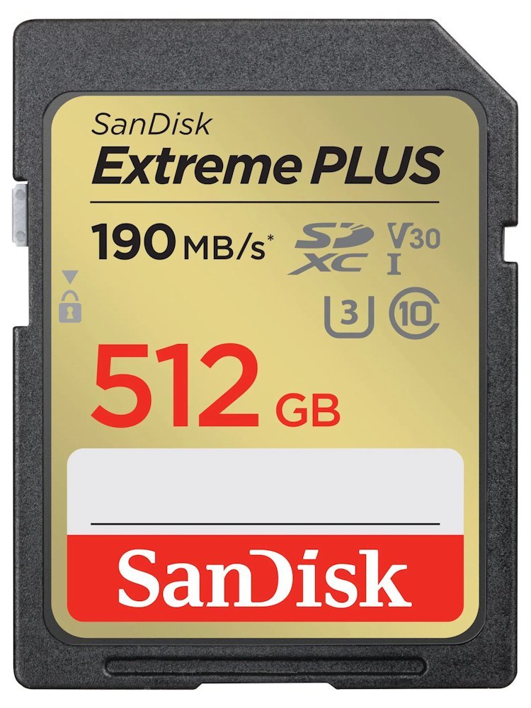 Paměťová karta formátu SDXC nabízí kapacitu 512 GB. Rychlost čtení je až 190 MB/s a rychlost zápisu až 130 MB/s. Součástí je software pro obnovu dat RescuePRO s licencí na 2 roky, který umožňuje obnovit omylem smazané obrázky.
