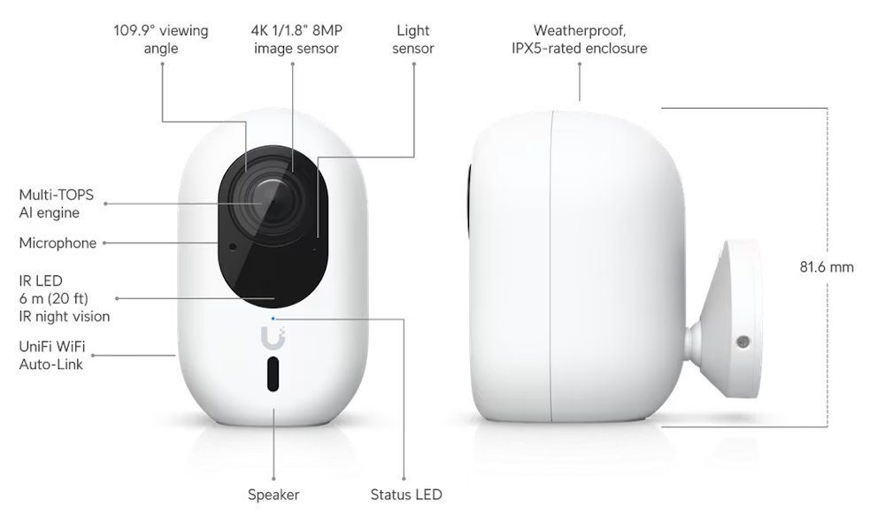 Kamera Ubiquiti G6 Instant poskytuje čistý a ostrý obraz v rozlišení 3840 × 2160 při 30 fps s možností nočního vidění. Kamera podporuje detekci osob, vozidel a zvířat, stejně jako rozpoznávání obličejů a registračních značek.