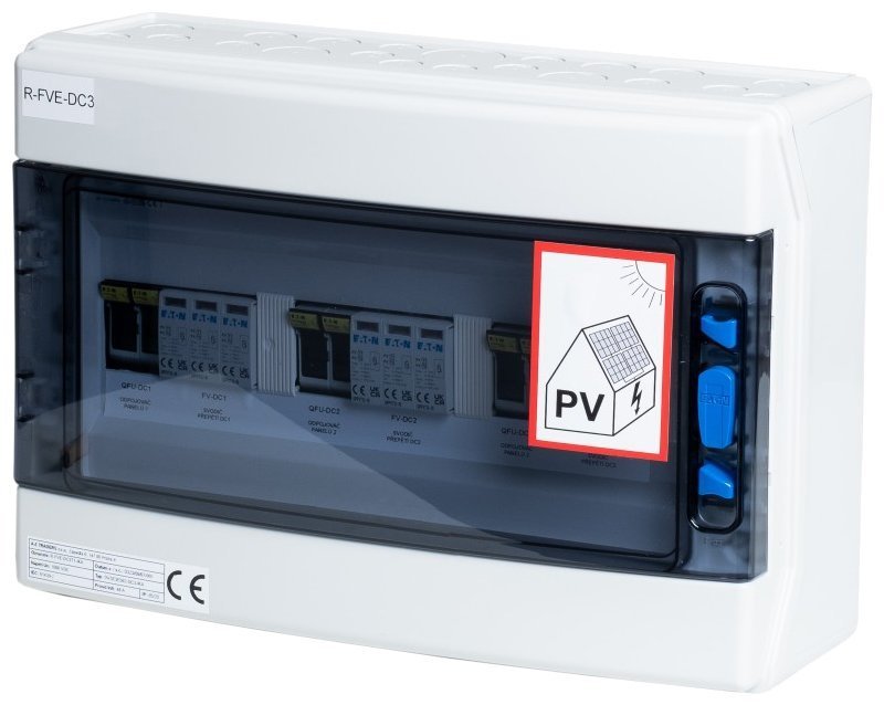 DC rozváděč určený pro montáž na zeď, IP65/20 sloužící jako vstupní rozváděč od fotovoltaických panelů (ke střídači) pro celé portfolio fotovoltaických elektráren.