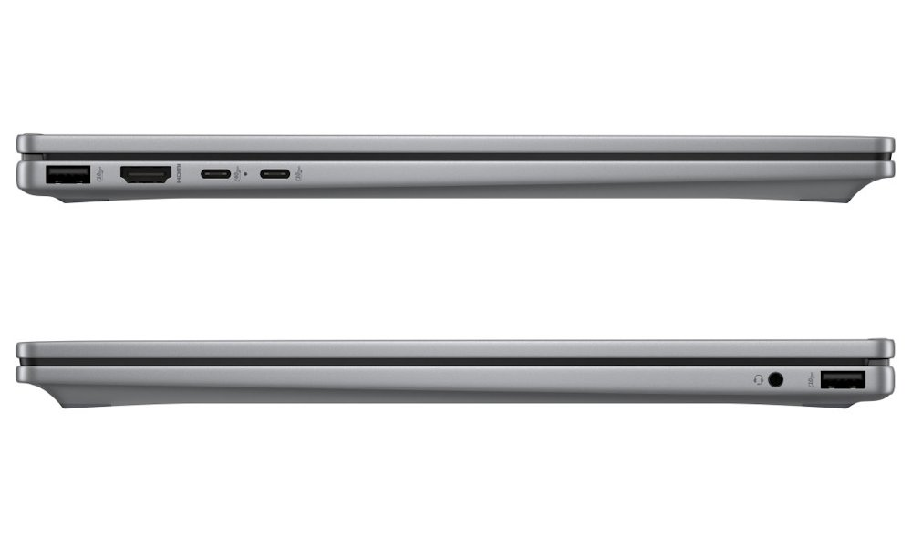 Notebook je vybaven nejnovějšími technologiemi pro bezdrátové připojení včetně Wi-Fi 7 a Bluetooth 5.4. Dva USB-C porty podporují DisplayPort 2.1 a HDMI 2.1 pro připojení externích displejů s rozlišením až 5K při 60 Hz. Jeden z portů USB-C umožňuje přenos dat rychlostí až 40 Gb/s a slouží také k nabíjení notebooku.