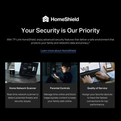 Integrovaný bezpečnostní systém chrání celou domácí síť před kybernetickými hrozbami. Rodičovská kontrola umožňuje spravovat online čas dětí a blokovat nevhodný obsah.