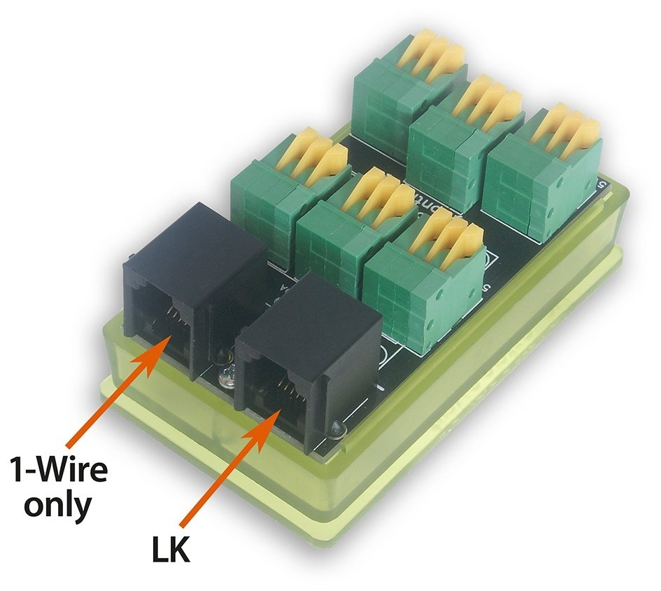 Deska je vybavena pružinovými svorkami pro pohodlné připojení teplotních senzorů DS18B20 (pro vodiče s průřezem až 0,5 mm²). Všechny vstupy jsou přehledně označeny přímo na desce. Díky dvěma RJ-12 konektorům můžete snadno propojit zařízení s LK kontrolérem nebo připojit další 1-Wire senzory.