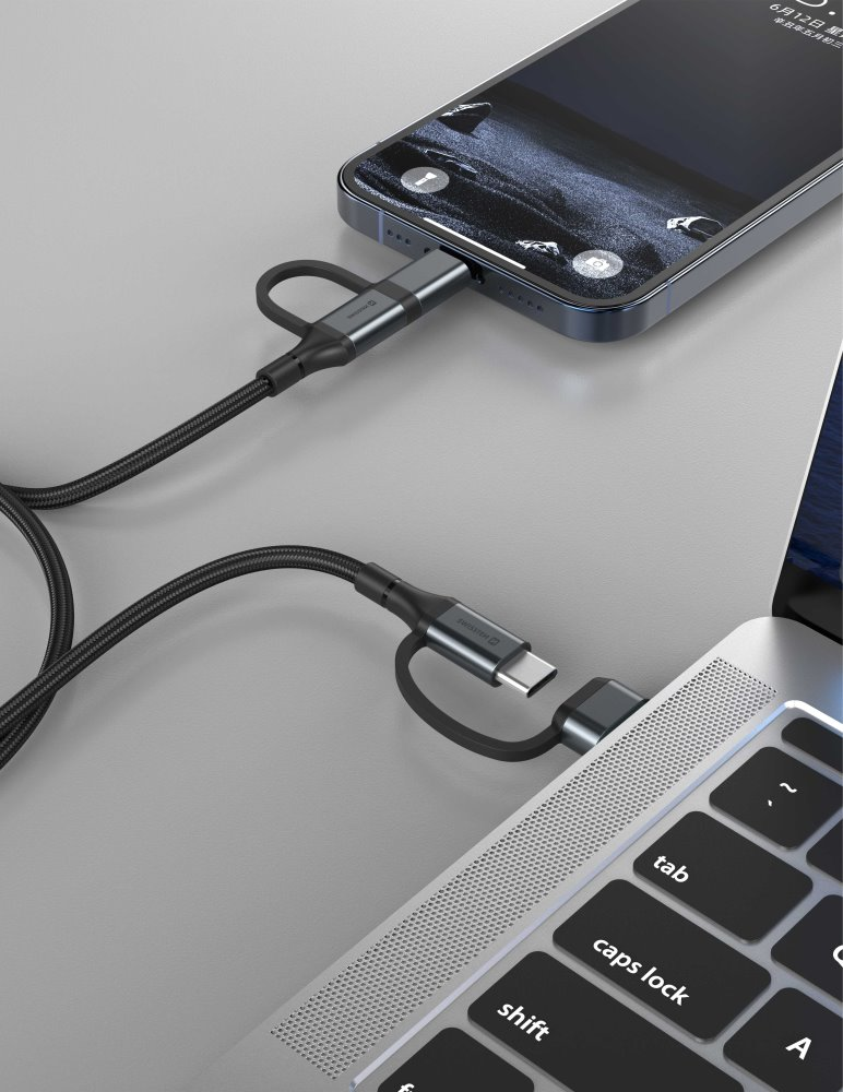 Díky čtyřem různým konektorům je tento kabel kompatibilní s většinou moderních zařízení na trhu. Konektory USB / USB-C a USB-C / Lightning umožňují nabíjet a synchronizovat data s telefony a tablety různých výrobců.
