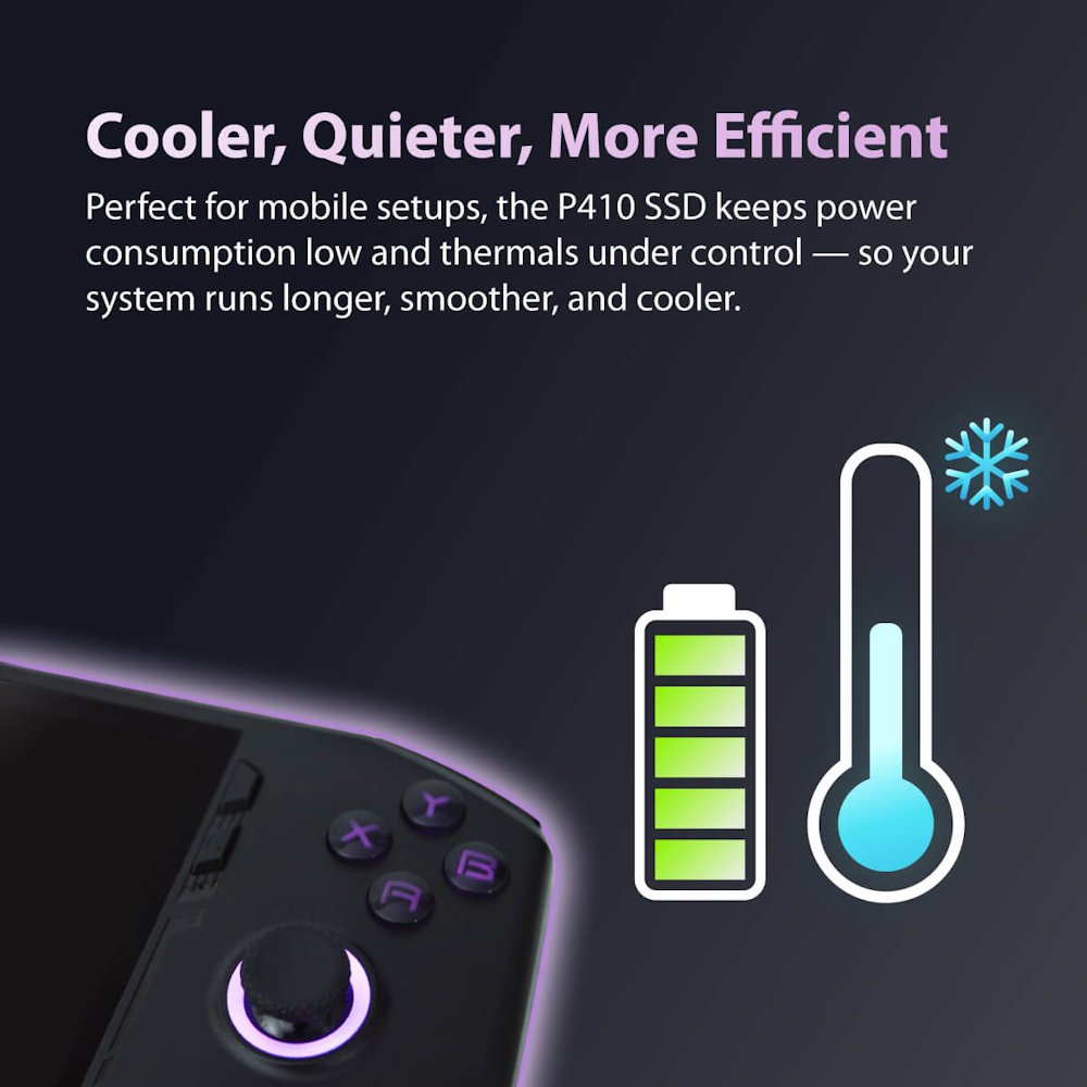 P410 SSD je vybaven vysoce účinným grafenovým chladičem a technologií tepelného řízení, které udržují systém v optimálních teplotách i při vysoké zátěži. Tím je zajištěn stabilní výkon a prodloužena životnost disku.