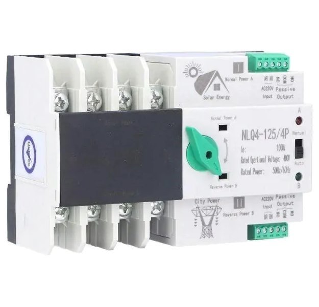 Automatický přepínač sítí s pasivními silovými kontakty 4P a ovládacími kontakty pro řízení zařízení podle přítomnosti síťového napětí.