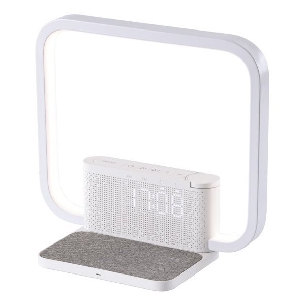 Multifunkční LED stolní lampa kombinující osvětlení, budík, bezdrátové nabíjení a relaxační zvuky v jednom elegantním zařízení.
