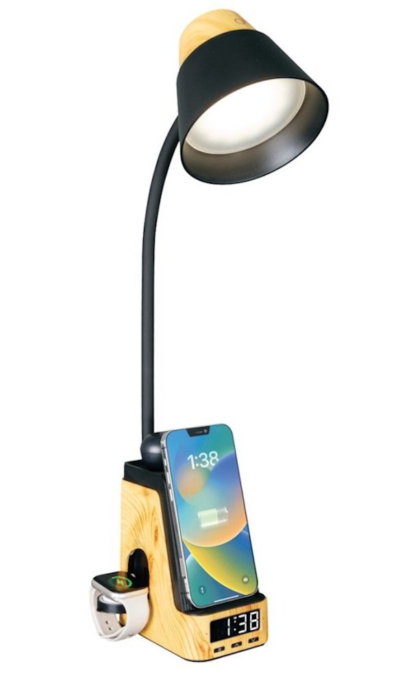 Moderní stolní lampa kombinuje kvalitní osvětlení s praktickou nabíjecí funkcí pro telefony, sluchátka a chytré hodinky. Elegantní design v dekoru světlého dřeva s černými prvky dokonale doplní moderní pracovnu, ložnici nebo dětský pokoj.