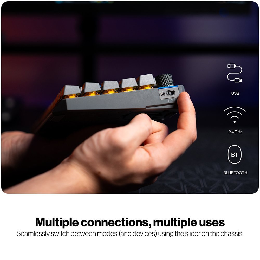 Druhá generace populární řady Thock přináší ještě větší pohodlí a univerzálnost díky trojímu způsobu připojení – Bluetooth, 2,4GHz bezdrátový přijímač nebo USB kabel. Klávesnice využívá exkluzivní lineární spínače Endorfy Yellow by Gateron s tovární lubrikací a podporuje hot-swap funkci pro snadnou výměnu spínačů za provozu.