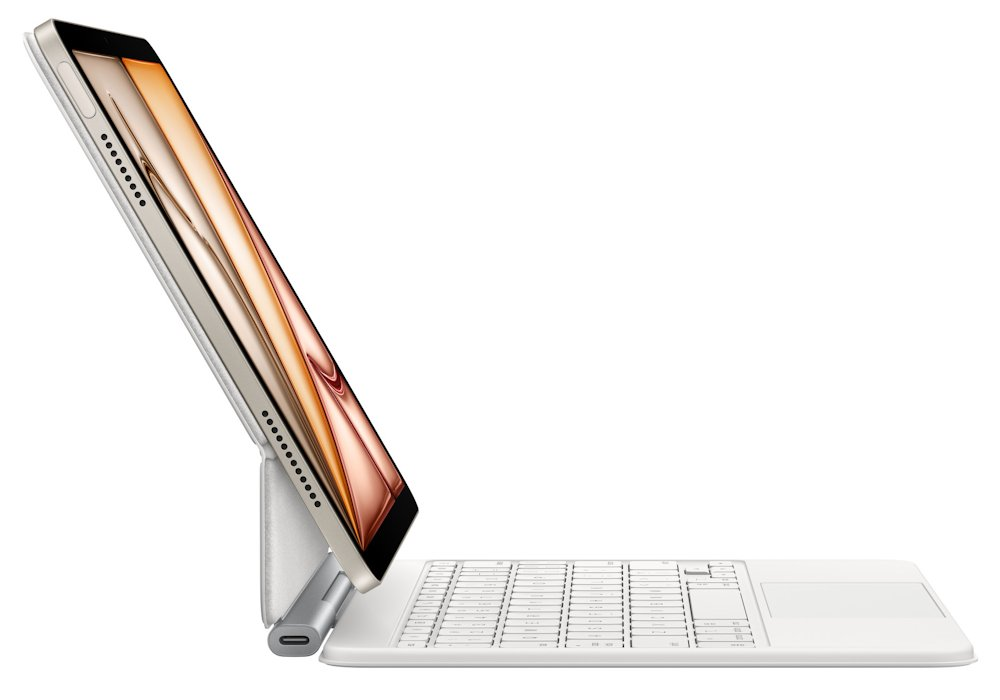 Magic Keyboard pro iPad Air slouží jako klávesnice a elegantní pouzdro v jednom. Konzolová konstrukce se dá plynule nastavit do různých úhlů pro komfortní sledování obrazovky. Velký skleněný trackpad přináší citlivé a intuitivní ovládání, zatímco klávesy mají nůžkový mechanismus s 1mm zdvihem pro pohodlné psaní. Řádek 14 funkčních kláves umožňuje pohotově ovládat jas, hlasitost a další funkce. Na boční straně se nachází port USB-C, skrze který lze iPad nabíjet.