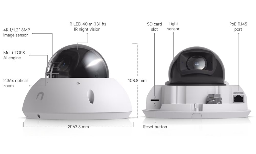 Kamera UniFi G6 Pro Dome představuje špičkové řešení pro profesionální videosledování s Multi-TOPS AI procesorem pro inteligentní detekci osob, vozidel (včetně čtení SPZ) a zvířat. Velký 1/1,2" CMOS senzor s rozlišením 4K a pokročilou technologií 2DNR/3DNR zajišťuje výjimečnou kvalitu obrazu i za ztížených světelných podmínek.