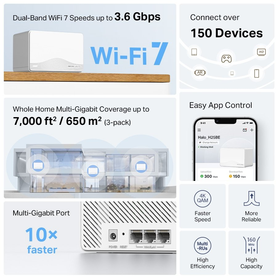 Představujeme nejnovější generaci mesh technologie s podporou standardu Wi-Fi 7 (802.11be) a celkovou rychlostí 3,6 Gbps. Systém se skládá ze tří jednotek, které vytvoří jednotnou síť s jedním názvem a automatickým přepínáním mezi přístupovými body pro optimální výkon v každém místě domova.