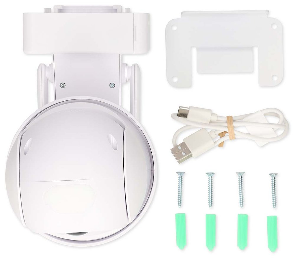 Kamera s baterií 6700 mAh, nástěnný držák, USB kabel, instalační materiály, návod k použití.