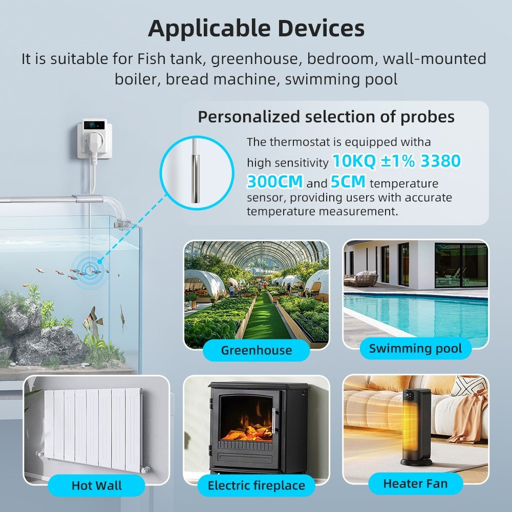 Zásuvka je vybavena dvěma externími NTC teplotními čidly. Kratší čidlo o délce 5 cm je vhodné pro měření v bezprostřední blízkosti zásuvky, zatímco 3metrové čidlo umožňuje monitorovat teplotu ve vzdálenějších místech místnosti.