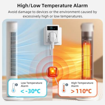 Chytrá Wi-Fi zásuvka s integrovaným teploměrem pro automatické ovládání spotřebičů podle naměřené teploty.