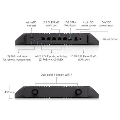 Klíčovou vlastností je vysoký PoE+++ výkon až 90 W na port s celkovým PoE budgetem 270 W při použití dodávaného 350W adaptéru. To umožňuje přímé napájení satelitních LEO terminálů, downstream switchů nebo kamer bez nutnosti dalších injektorů. Zařízení podporuje Remote SIM pro zjednodušené připojení přes UniFi 5G Max Outdoor a nabízí kompletní sadu UniFi aplikací včetně Network, Protect, Access, Talk a Connect.
