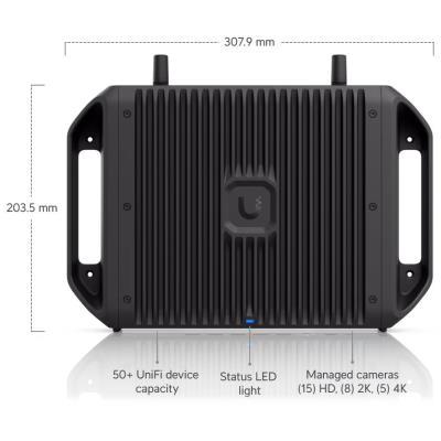 UniFi Cloud Gateway Industrial představuje robustní řešení pro průmyslové a vzdálené lokace, kde je kladen důraz na spolehlivost a odolnost. Zařízení je navrženo pro provoz v teplotním rozsahu -30 až +50 °C s konstrukcí bez ventilátorů, která eliminuje riziko selhání pohyblivých částí. Kombinuje funkce 10gigabitové brány, Wi-Fi 7 access pointu s rychlostí až 4,3 Gbps na 5 GHz a UniFi Protect NVR s předinstalovanou 128GB microSD kartou.