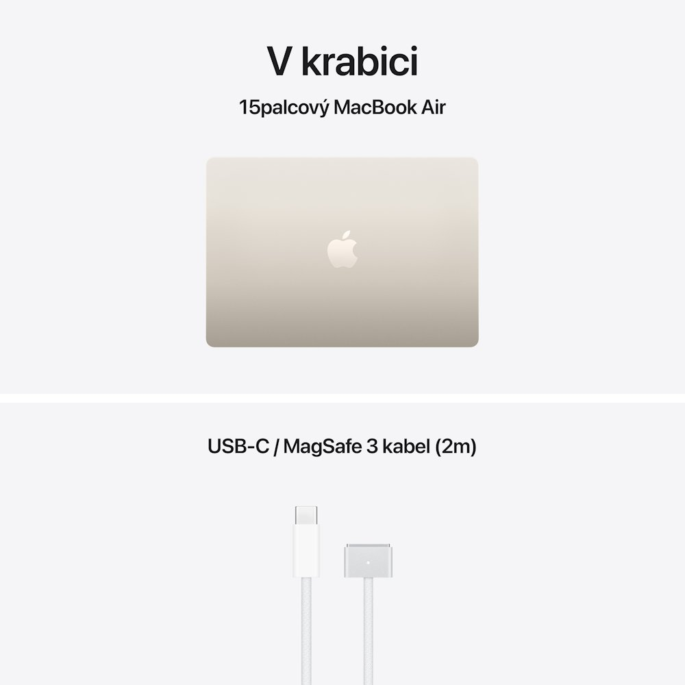 15palcový MacBook Air, USB-C / MagSafe 3 kabel (2 m). Napájecí adaptér není součástí balení.
