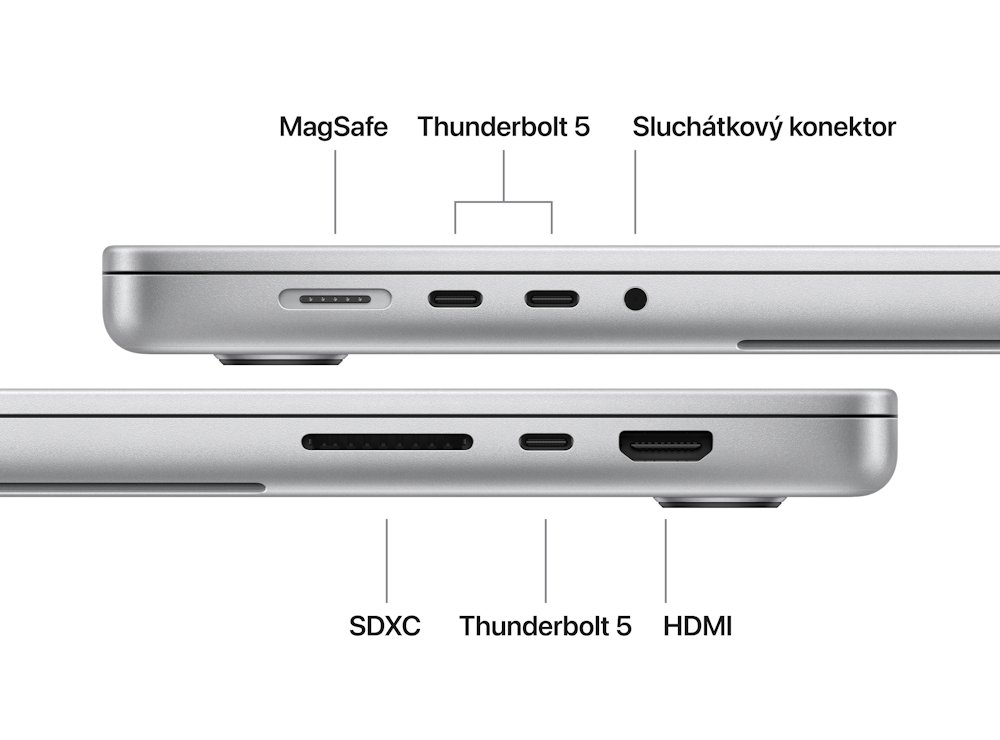 Konektivita: 3× Thunderbolt 5 (až 120 Gb/s), HDMI (až 8K), slot SDXC, MagSafe 3, 3,5mm jack, Wi-Fi 7, Bluetooth 6